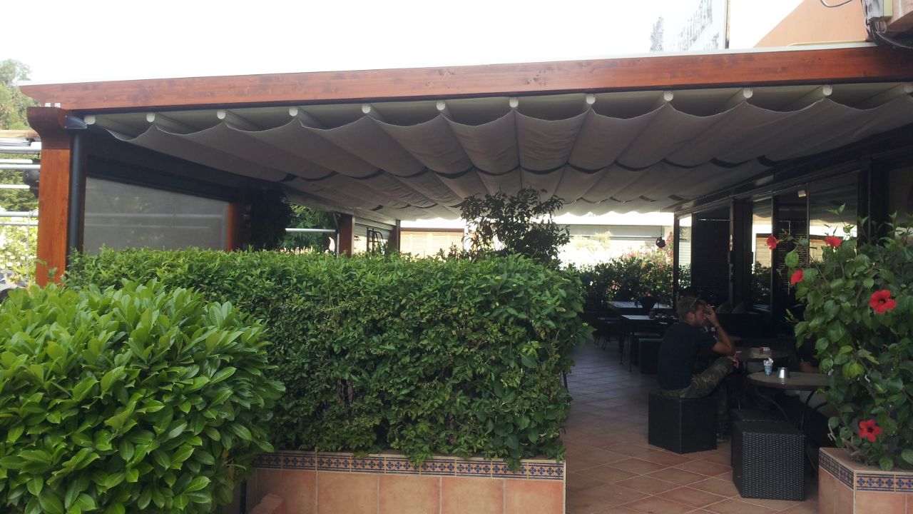 Abbiamo creato una veranda per la gelateria che può ospitare tutto l’anno 55 posti a sedere in più,il cliente ha scelto pergowood per integrare il design al giardino intorno.