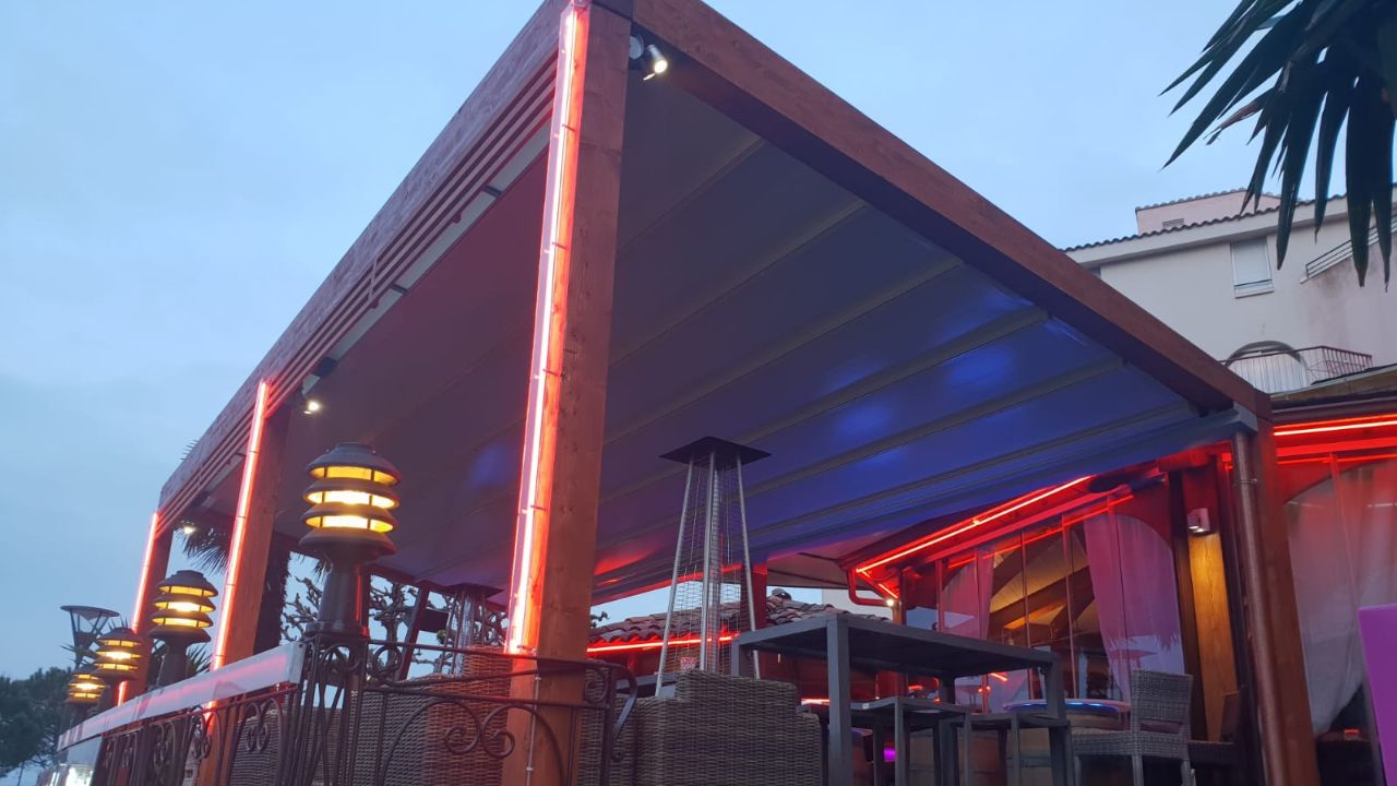 Per il Tropicana abbiamo realizzato una veranda autoportante con decorazioni in legno e luci led Luxy che danno un tocco originale e alla moda all’ambiente.